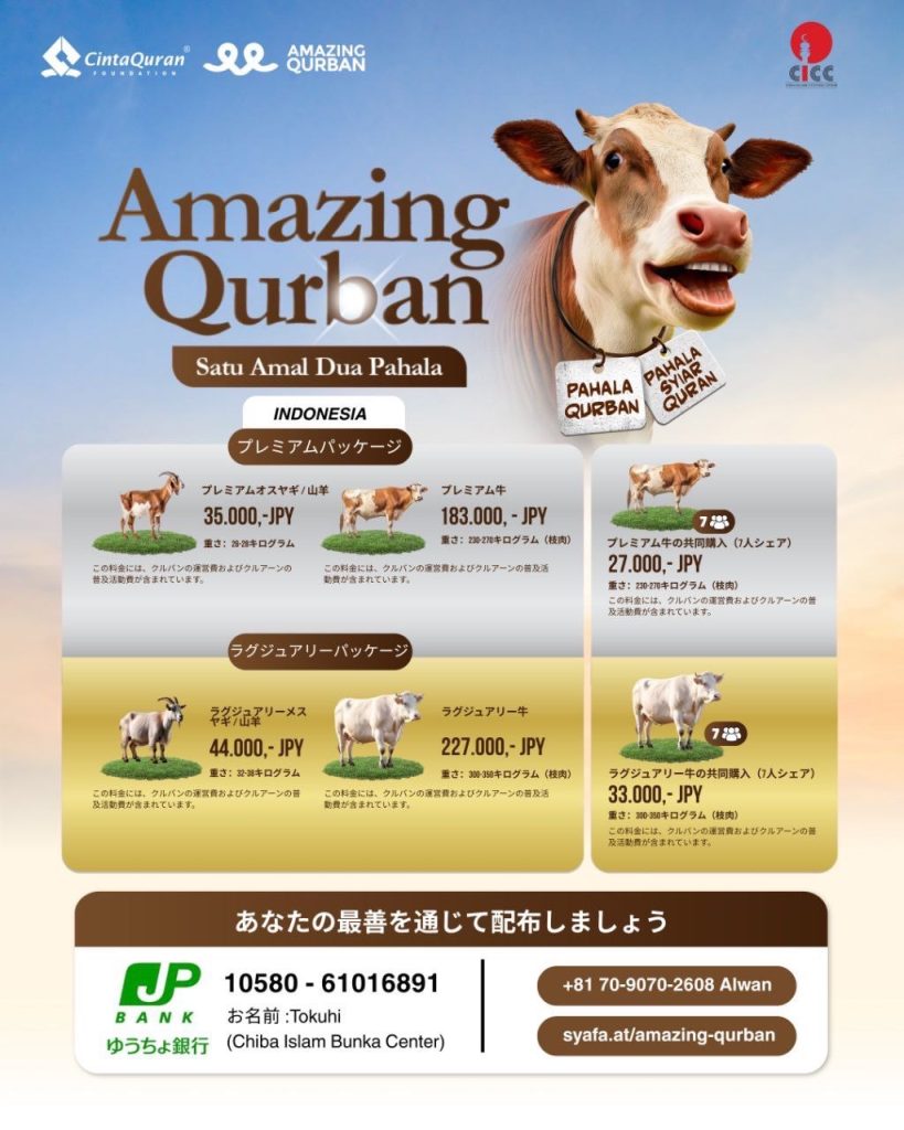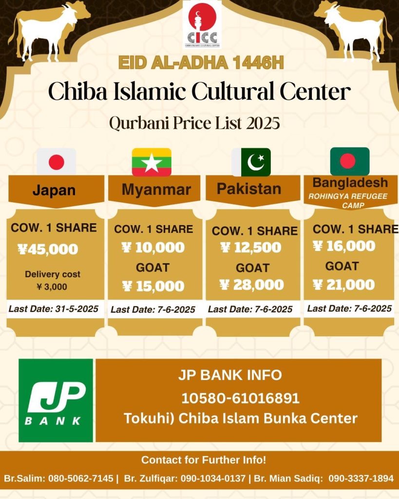 マレーシア政府の発表によると、日本においては2025年6月7日土曜日がイード・アル・アドハー(犠牲祭)になります。CICCでのイード礼拝は3回実施します。礼拝の開始時刻は午前7:00、8:00、9:00です。事前登録をお願いいたします。登録はこちらから→ https://forms.gle/bYKbHDTgs89ds29A7