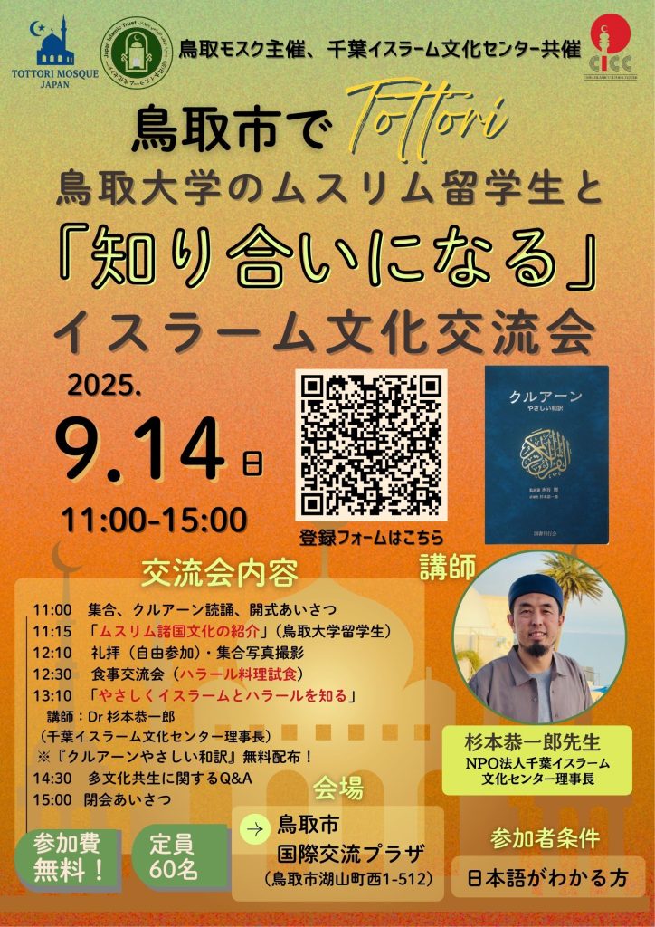 千葉イスラーム文化センターは、鳥取モスクと共に以下の内容で、鳥取市で「知り合いになる」イスラーム文化交流会を開催します 。ぜひご家族や友人と共にご参加ください。登録はこちら→ https://forms.gle/gSLBvNdHV8SvfSbL9